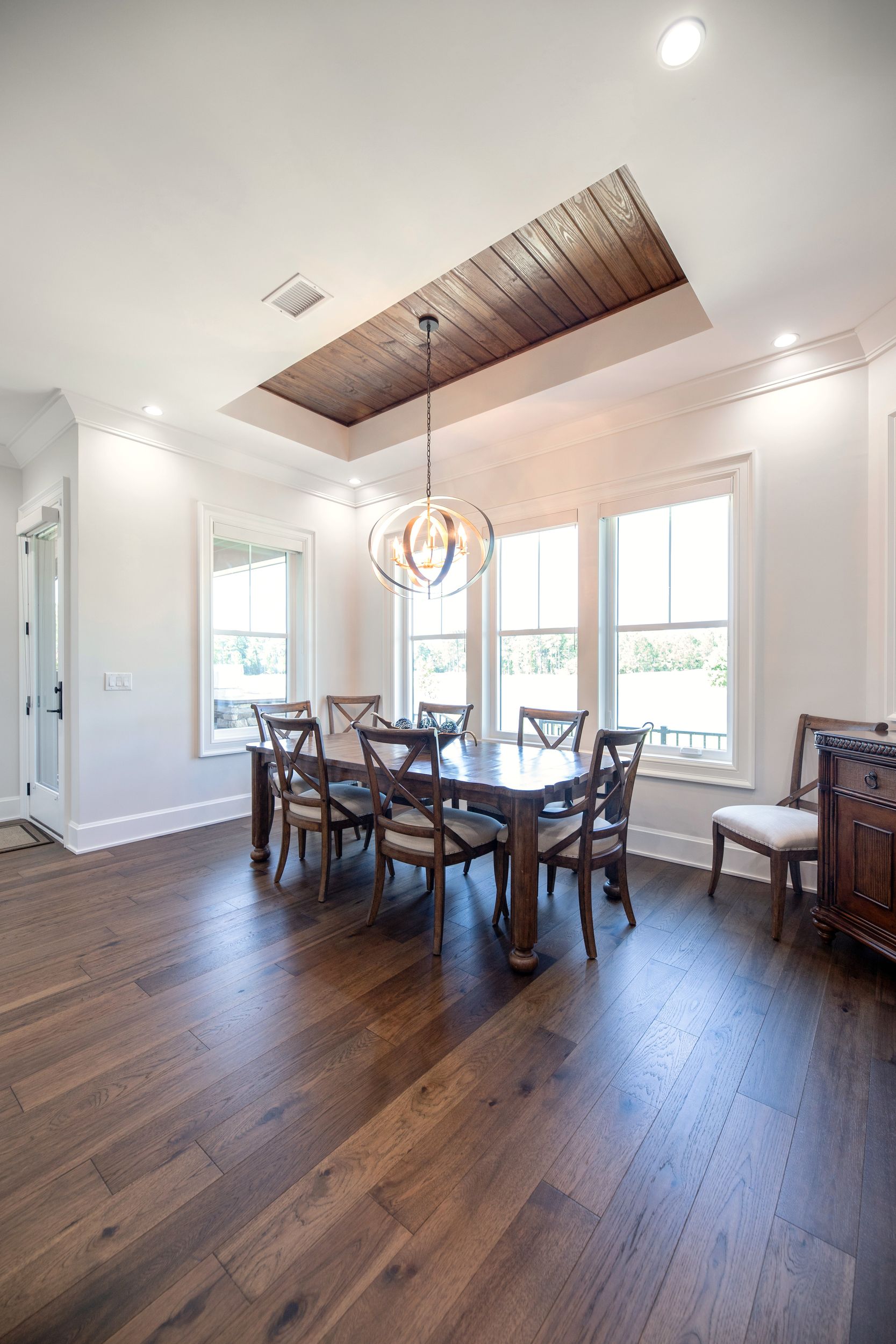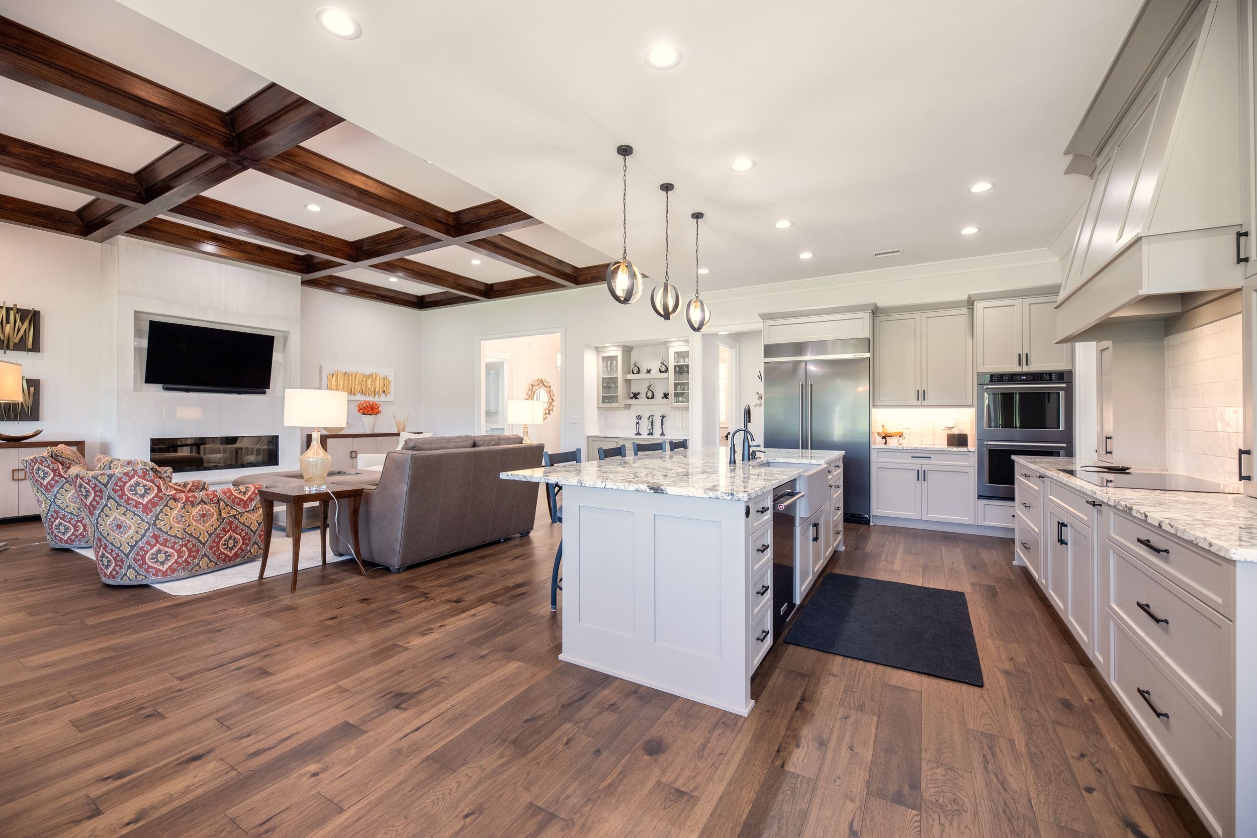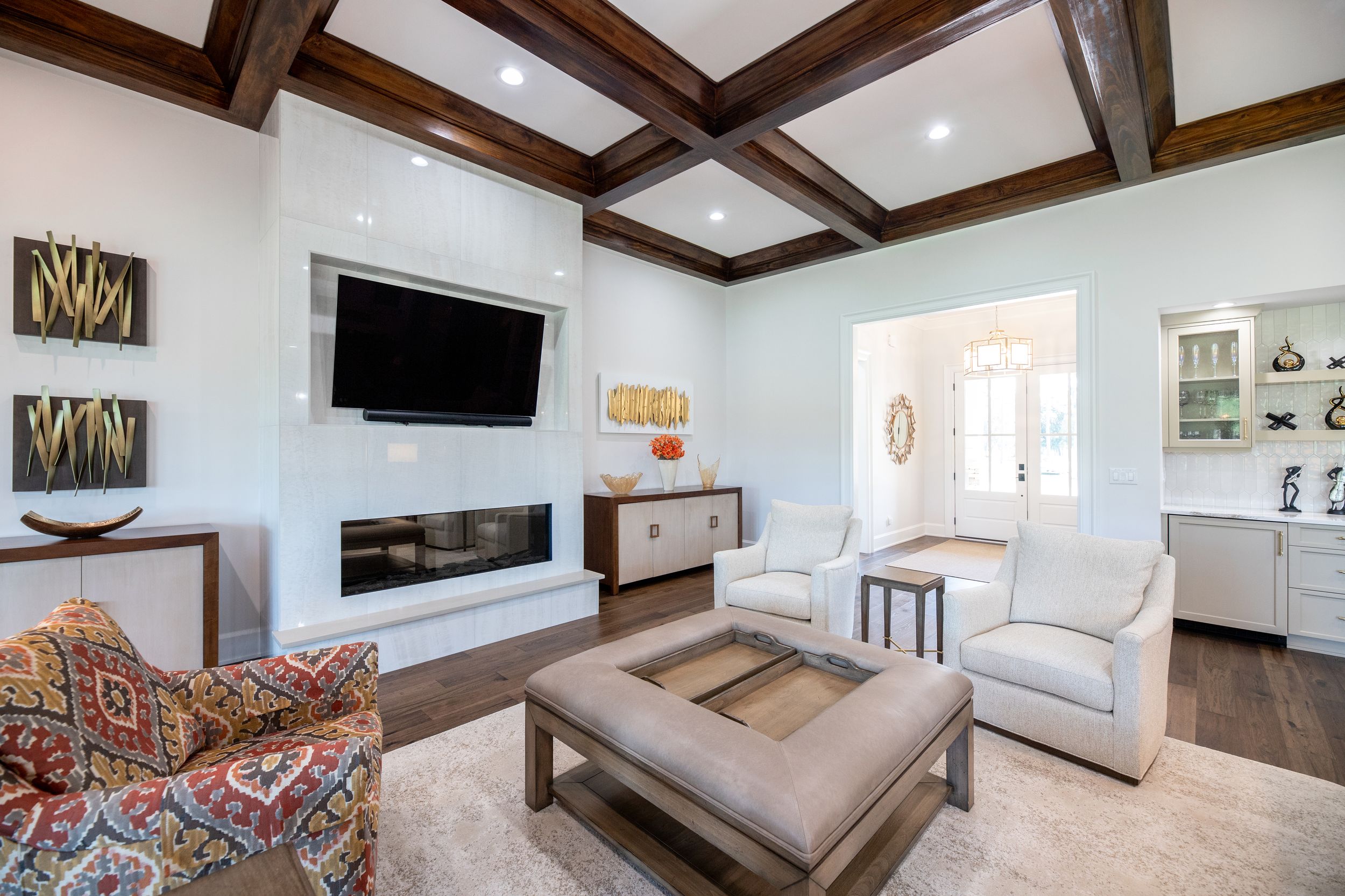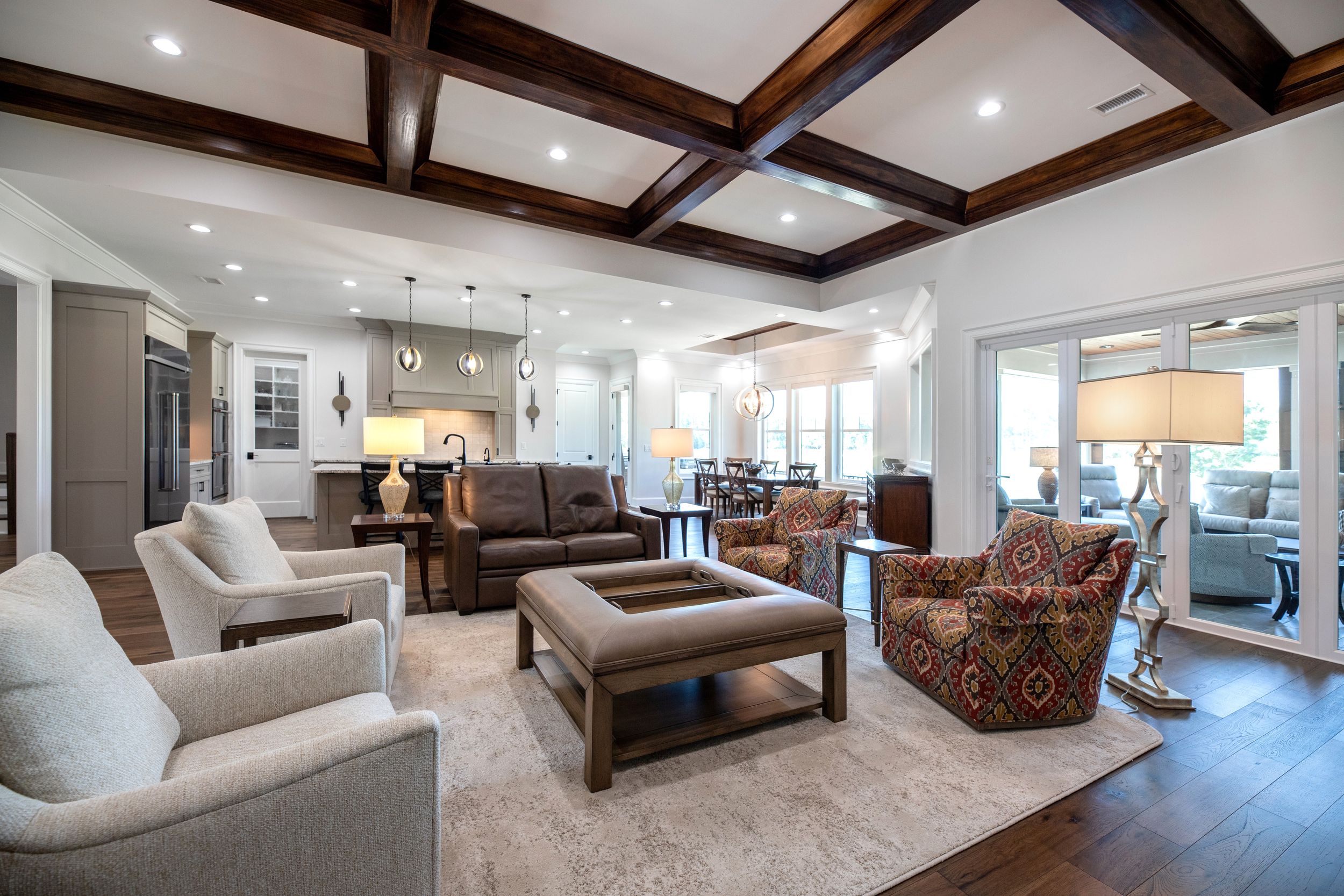 • Wood stained coffered ceiling in living room
