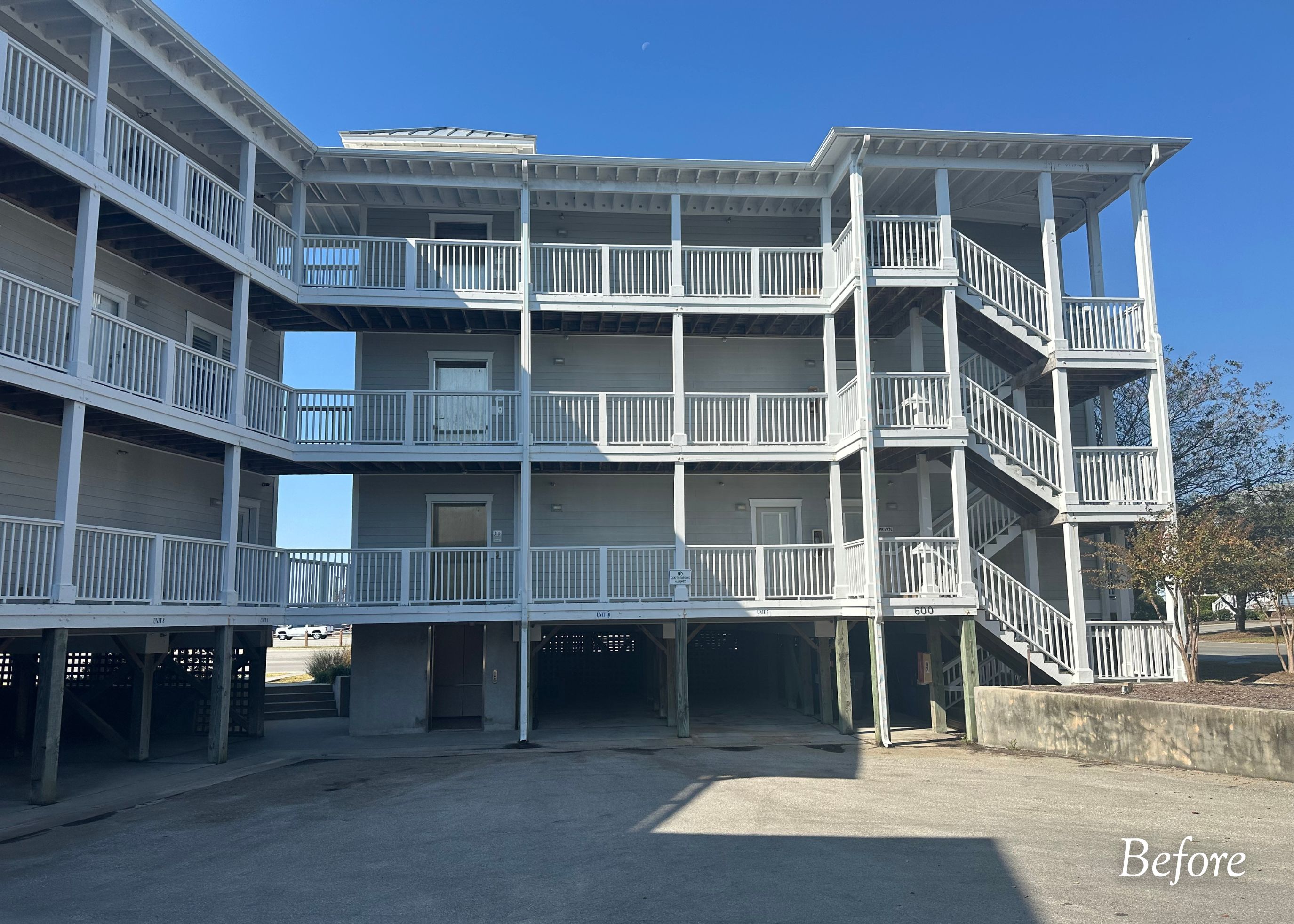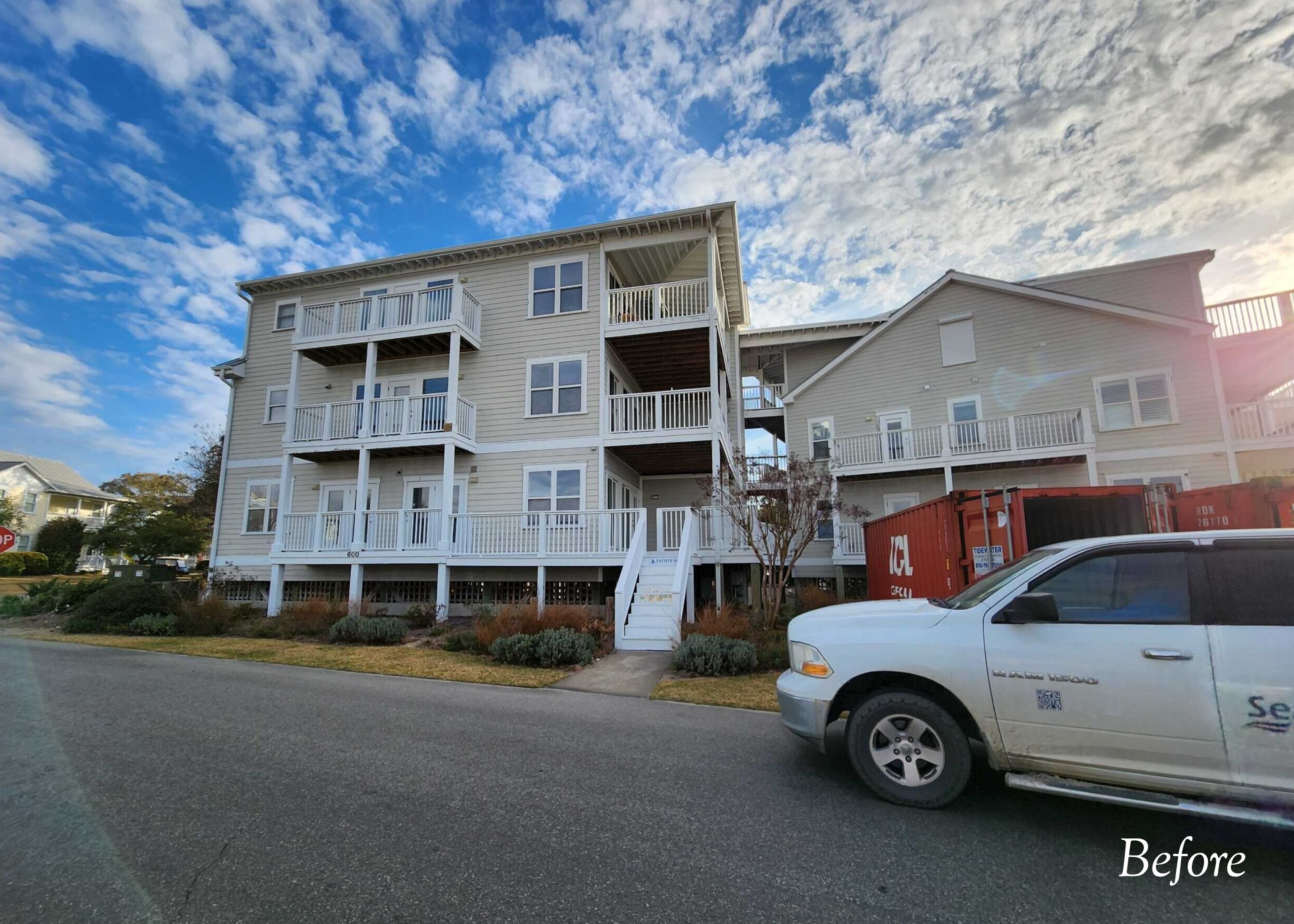SCH was contracted to completely refurbish the exteriors of both multi-story buildings of this commercial & residential complex in Southport. With stunning views of the Intracoastal Waterway & Southport Marina the buildings are in a prominent and desirable downtown location. While extensive repair was needed from long term moisture damage, SCH completed all structural and aesthetic repairs and upgrades. As a residential & commercial builder, SCH Property Development Corp (SeaCoast Homes), replaced all the siding, HVAC units, windows, exterior doors, locks, decking, railing & stairs. Interior drywall repair and painting was completed in all units. The siding was replaced with James Hardie ColorPlus Siding, with installation coordinated by a James Hardie certified team. SCH also replaced the decking, repaired the deck joists, and installed new copper flashing. The wood railings were replaced with white vinyl railings, and all posts were wrapped with PVC for long-lasting protection. Some staircases were rebuilt and "UpSide" Under-Decking was installed to provide waterproof enjoyment on the waterfront decks. While this project presented many challenges, both SCH and the owners were thrilled with the exceptional results. Special thanks go out to all 12 unit owners for their cooperation & kind words.